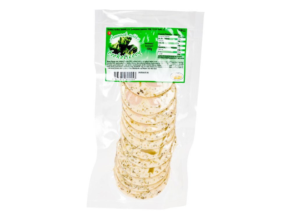 Zeleninový salám s brokolicí. Je nakrájený na tenké, praktické plátky a je tak připravený k rychlé přípravě svačiny. Neobsahuje lepek, pochutnají si tak na něm i celiaci.Specifikace
