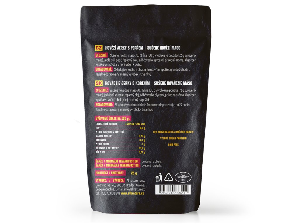 Sušené hovězí maso 70,1 % (na 100 g výrobku je použito 172 g syrového masa), jedlá sůl, pepř, řepkový olej, zvlhčovadlo: glycerol, přírodní aroma.