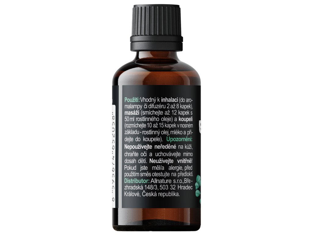 Allnature esenciální olej eukalyptus má silné protizánětlivé a antiseptické účinky. Je vhodným pomocníkem při nachlazení i zánětech horních cest dýchacích. Usnadňuje dýchání i vykašlávání, osvěžuje a snižuje horečku. Zlepšuje prokrvení pokožky a pomáhá uvolnit bolavé svaly a klouby. Hodí se pro děti od sedmi let.