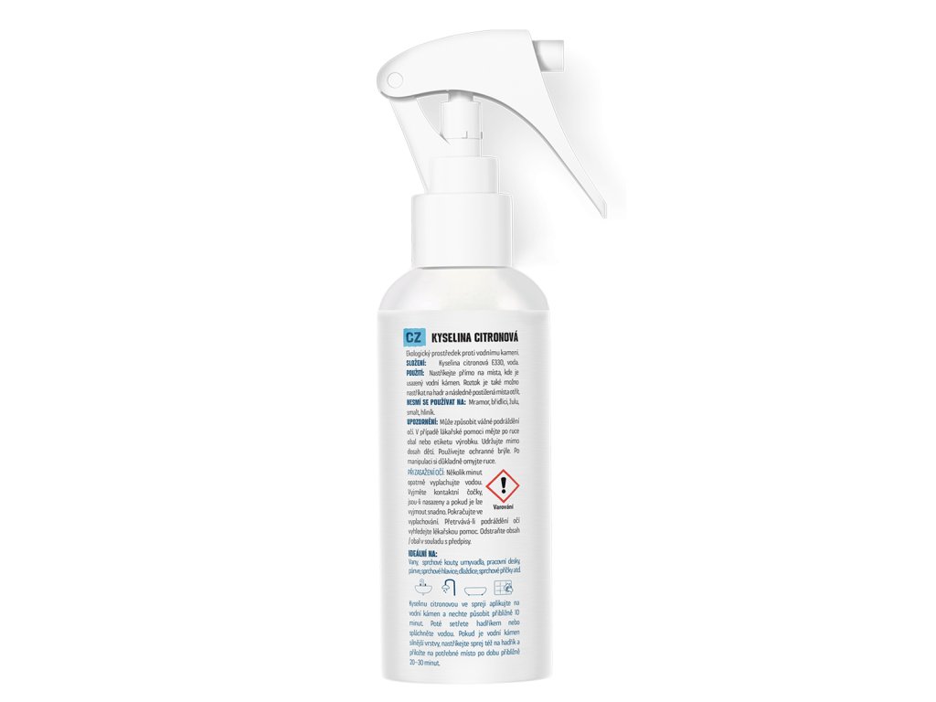 IDEÁLNÍ NA: Vany, sprchové kouty, umyvadla, pracovní desky, pánve, sprchové hlavice, dlaždice, sprchové příčky atd. Kyselinu citronovou ve spreji aplikujte na vodní kámen a nechte působit přibližně 10 minut. Poté setřete hadříkem nebo spláchněte vodou. Pokud je vodní kámen silnější vrstvy, nastříkejte sprej též na hadřík a přiložte na potřebné místo po dobu přibližně 20—30 minut.