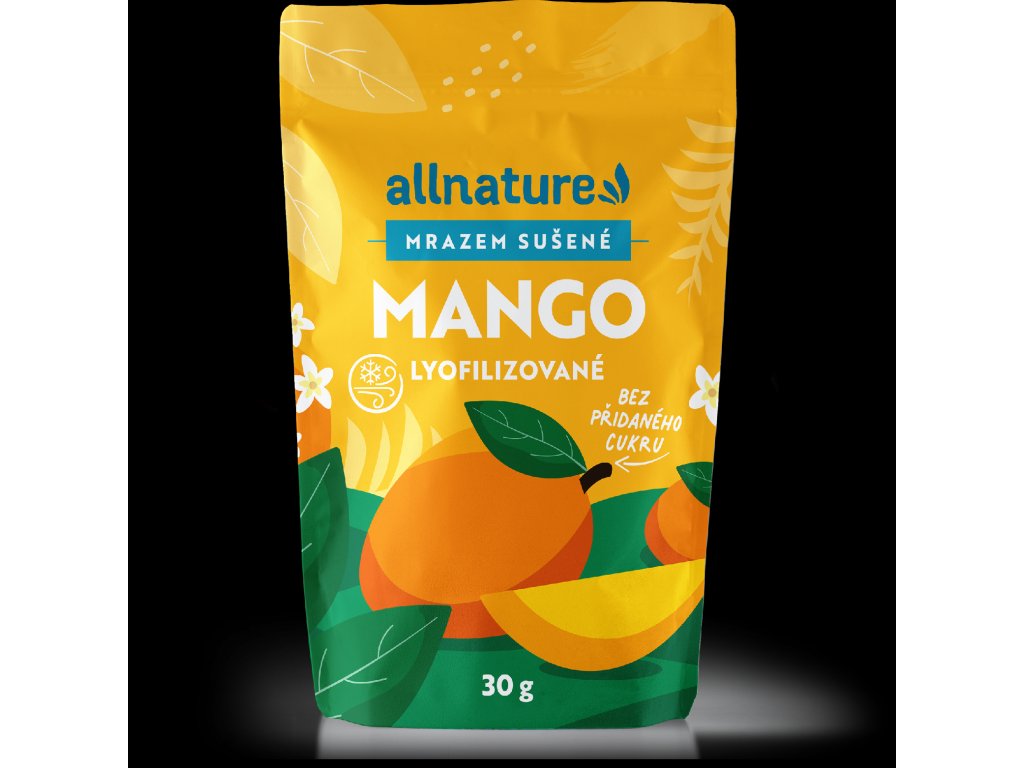 Mango sušené mrazem, neboli lyofilizované mango Allnature si díky šetrnému procesu lyofilizace zachovává barvu, chuť, vůni a živiny jako čerstvé mango. Proces lyofilizace spočívá v prudkém zmrazení a následném pomalém sušení ve vakuu, které mango zbaví 95 % vody. Lyofilizované mango Allnature nejsou dodatečně doslazovány. Ideální do jogurtů, musli, kaší, nejrůznějších dezertů nebo i jen tak samotné. Při správném skladování má lyofilizované mango velmi dlouhou trvanlivost.