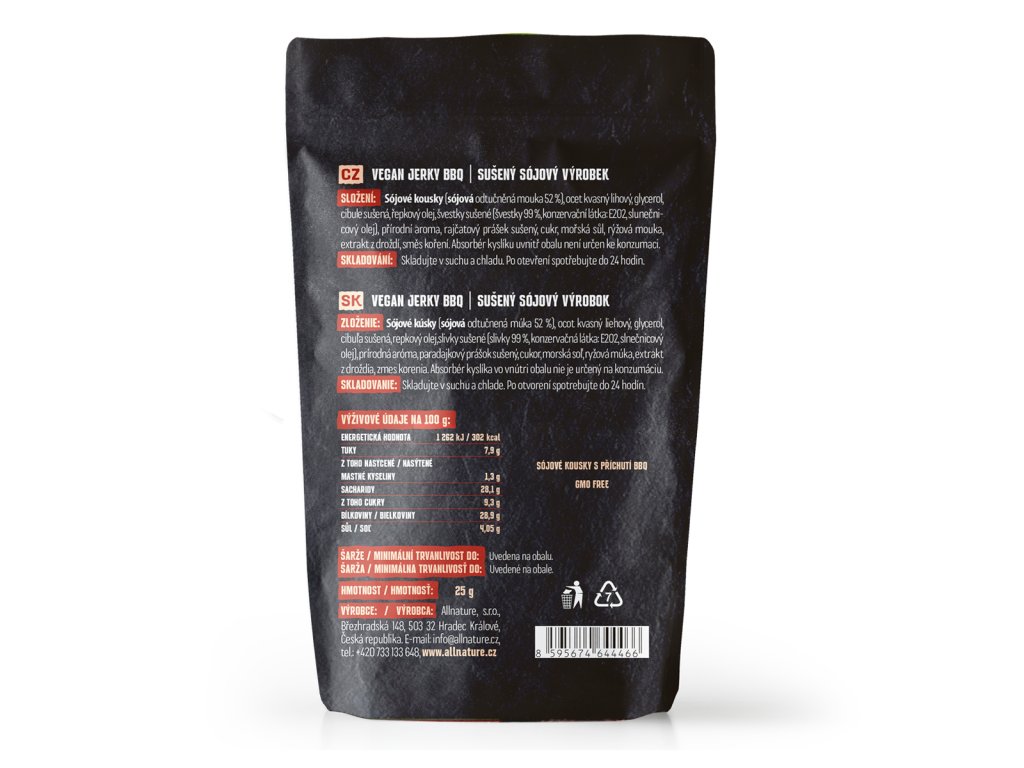 Sušené sójové kousky s příchutí BBQ představují tu nejlepší možnou alternativu masa. Veganské Jerky obsahují téměř nulové množství tuků a jsou bohaté na bílkoviny a vlákninu, díky kterým dodají svalům potřebnou regeneraci. Pochutná si na nich každý, kdo hledá ideální rychlou svačinu na cesty a výlety do přírody nebo jen potřebuje dodat energii přináročném dnu v práci.