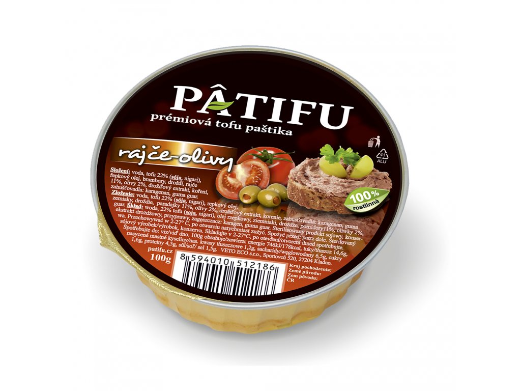 PATIFU paštika s rajčaty a olivami je pomazánka rostlinného původu vhodná jak pro vegany, vegetariány, tak třeba pro celiaky nebo diabetiky. Je chutnou součástí zdravého jídelníčku jako náhrada masa. Navíc se jedná o český výrobek, který neobsahuje glutamáty ani konzervanty, a přesto se díky praktickému balení hodí na dovolenou, do práce nebo do školy.Specifikace