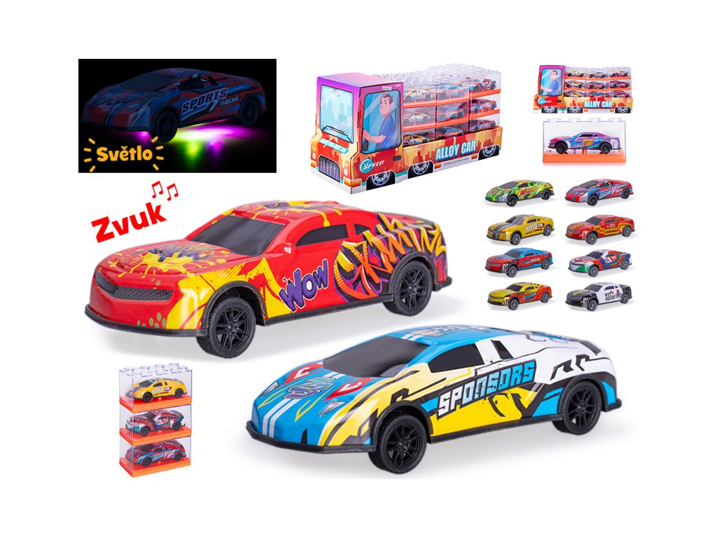 Auta závodní 12,5cm kov na zpětný chod na baterie se světlem a zvukem v krabičce 48ks v DBX