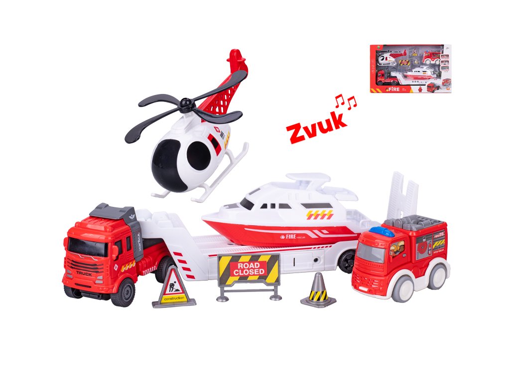 Auto nákladní 30cm na setrvačník na baterie se zvukem + vozidla hasiči 3ks a doplňky v krabičce