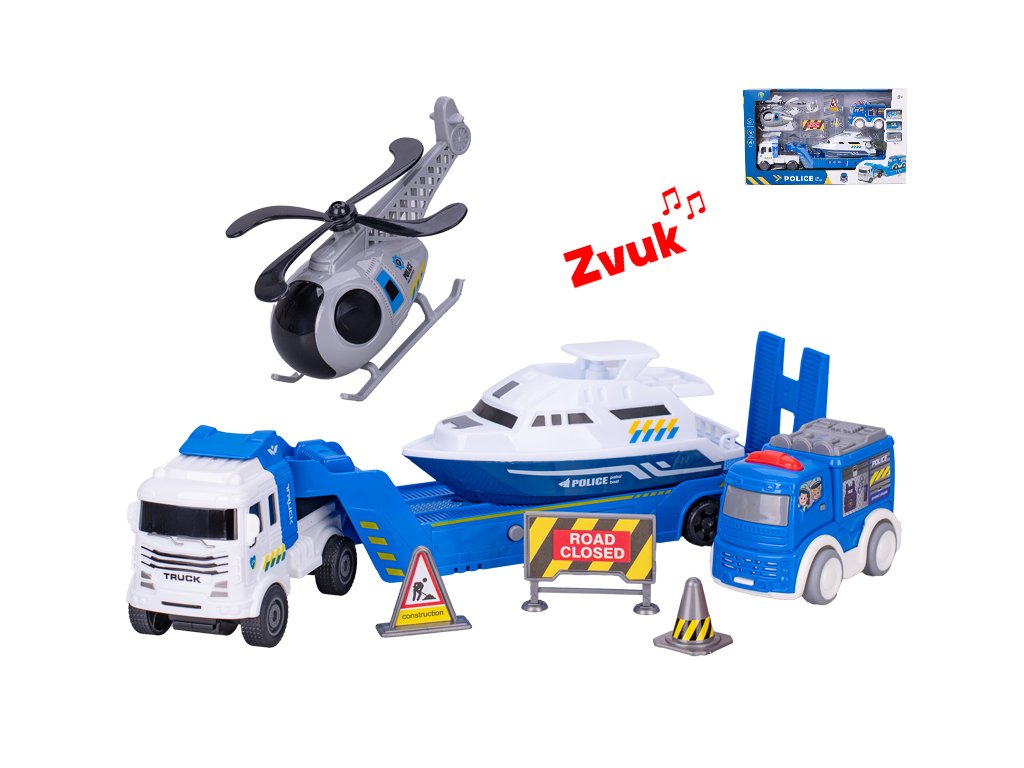 Auto nákladní 30cm na setrvačník na baterie se zvukem + vozidla policie 3ks a doplňky v krabičce