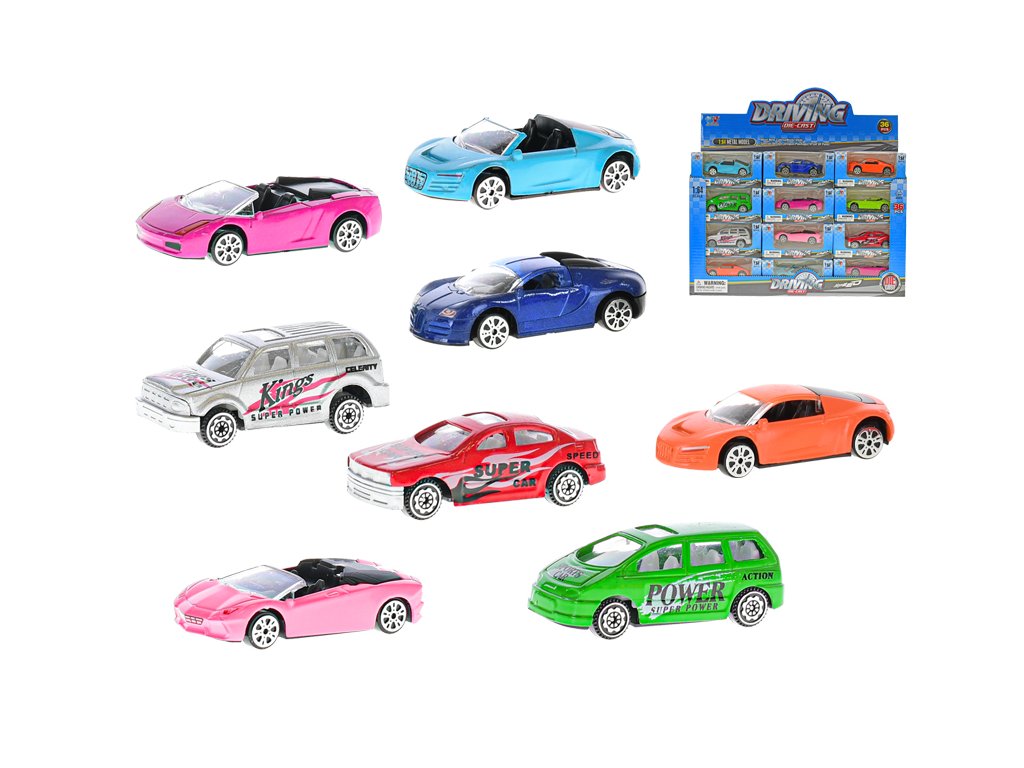Auto sportovní 7,5cm kov 1:64 volný chod 8druhů v krabičce 36ks v DBX