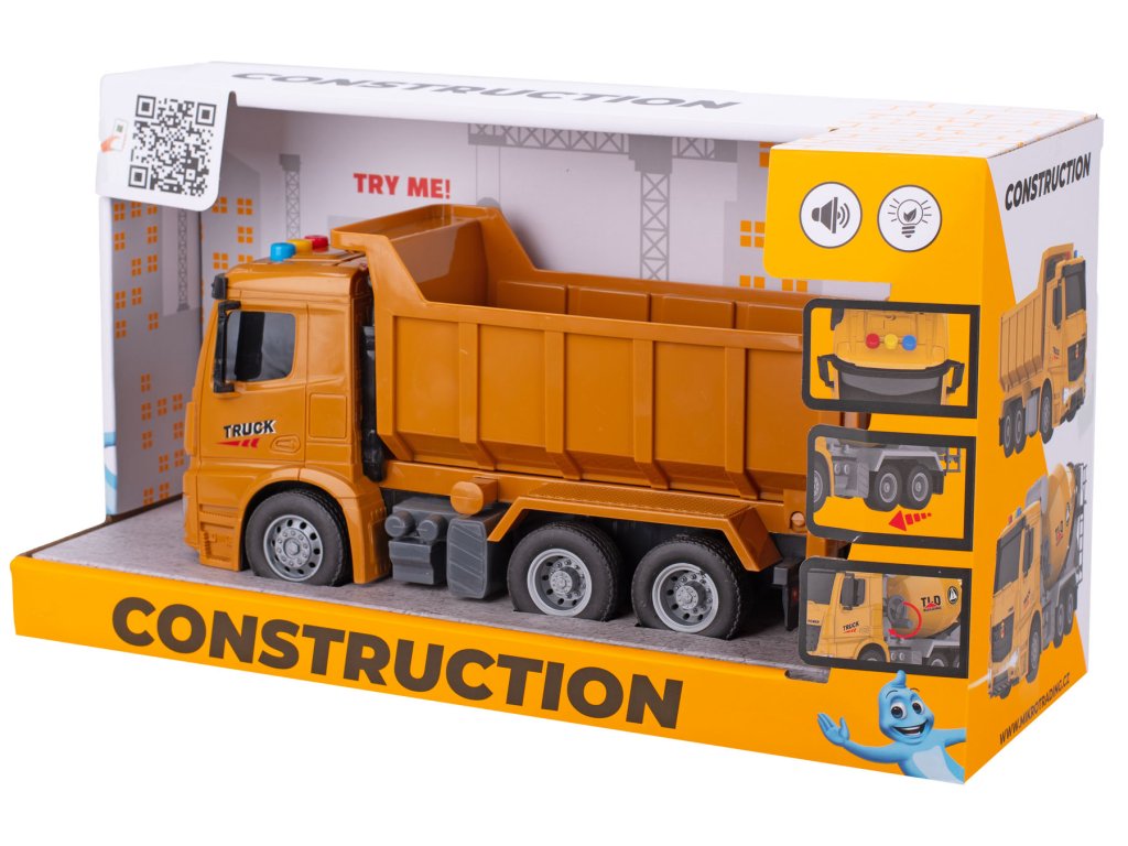 Auto stavební sklápěčka 26cm na setrvačník na baterie se světlem a zvukem v krabičce