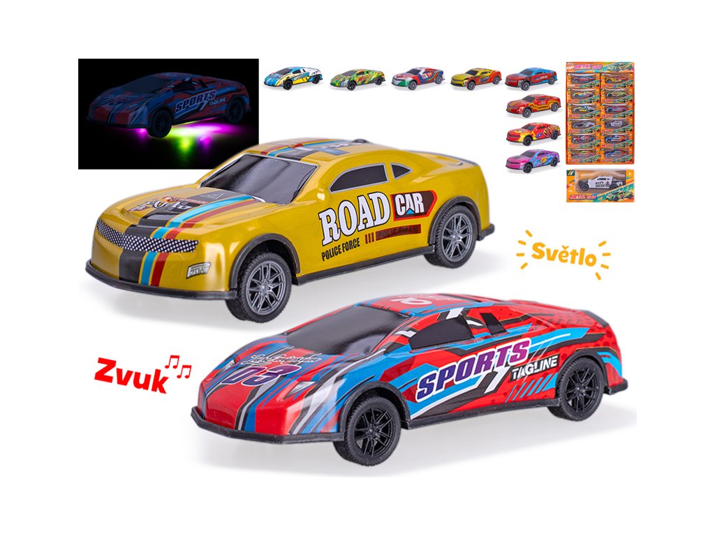 Auto závodní 12,5cm kov na zpětný chod na baterie světlo, zvuk v krabičce 2druhy 12barev 12ks v DBX