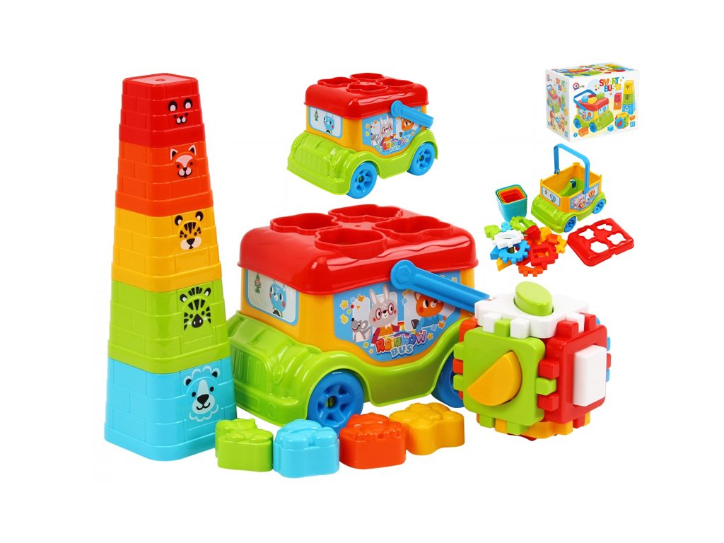 Autobus/vkládačka 20cm volný chod + pyramida skládací kalíšky 5ks a kostka vkládací 12m+ v krabičce