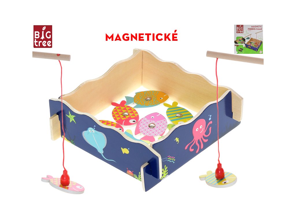 Big Tree rybář dřevěná hra 18x18cm se 2ks udiček a 9ks rybiček na magnet 24m+ v krabičce