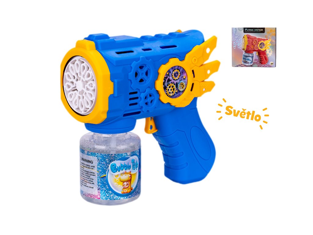 Bublifukovač pistole 13cm na baterie se světlem a s náplní 2barvy v krabičce