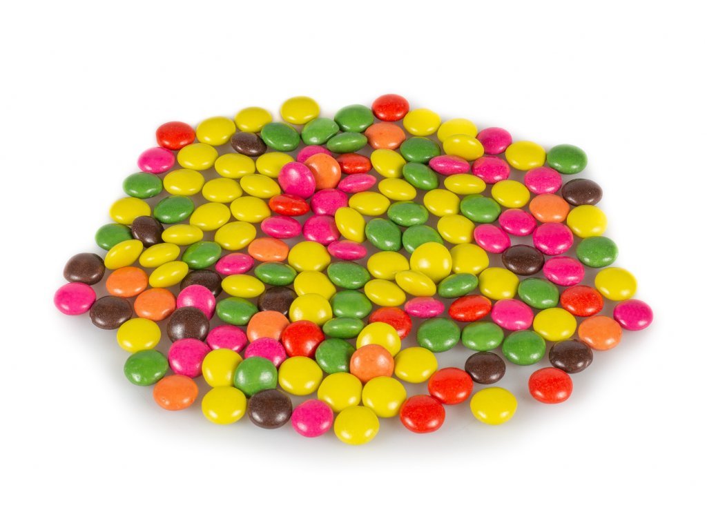Složení : Cukr 69%, kakaové máslo 14,5%, *sušená SYROVÁTKA 8%, kakaový prášek se sníženým obsahem tuku 5,5%, *sušené plnotučné MLÉKO, leštidla : arabská guma, karnaubský a včelí vosk, emulgátor: slunečnicový lecitin, barviva E101, E120, E141, E160a, E163, E171, E172.