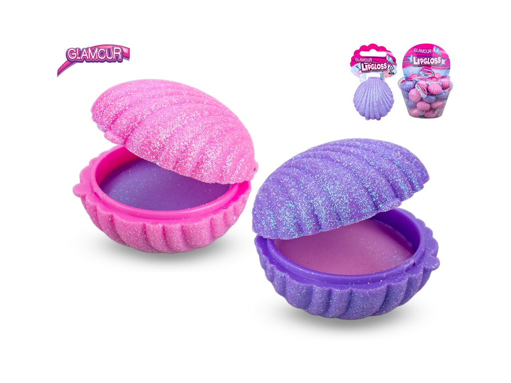 Glamour lesk na rty 7ml ve tvaru mušle 2barvy na kartě 32ks v plastové misce