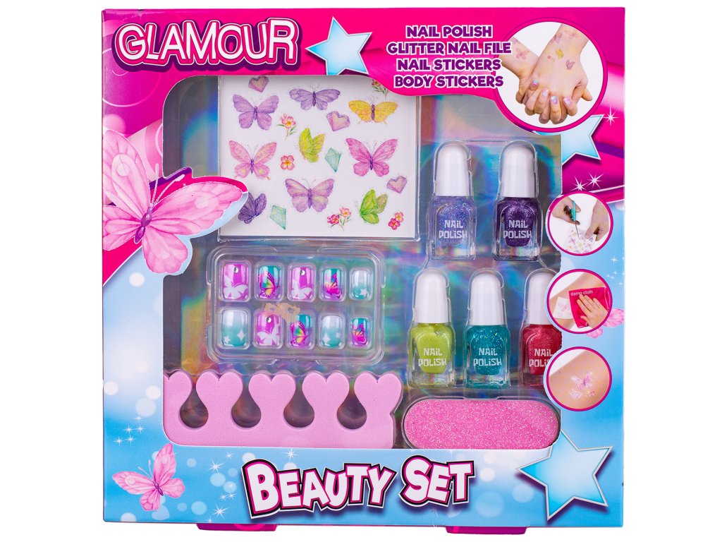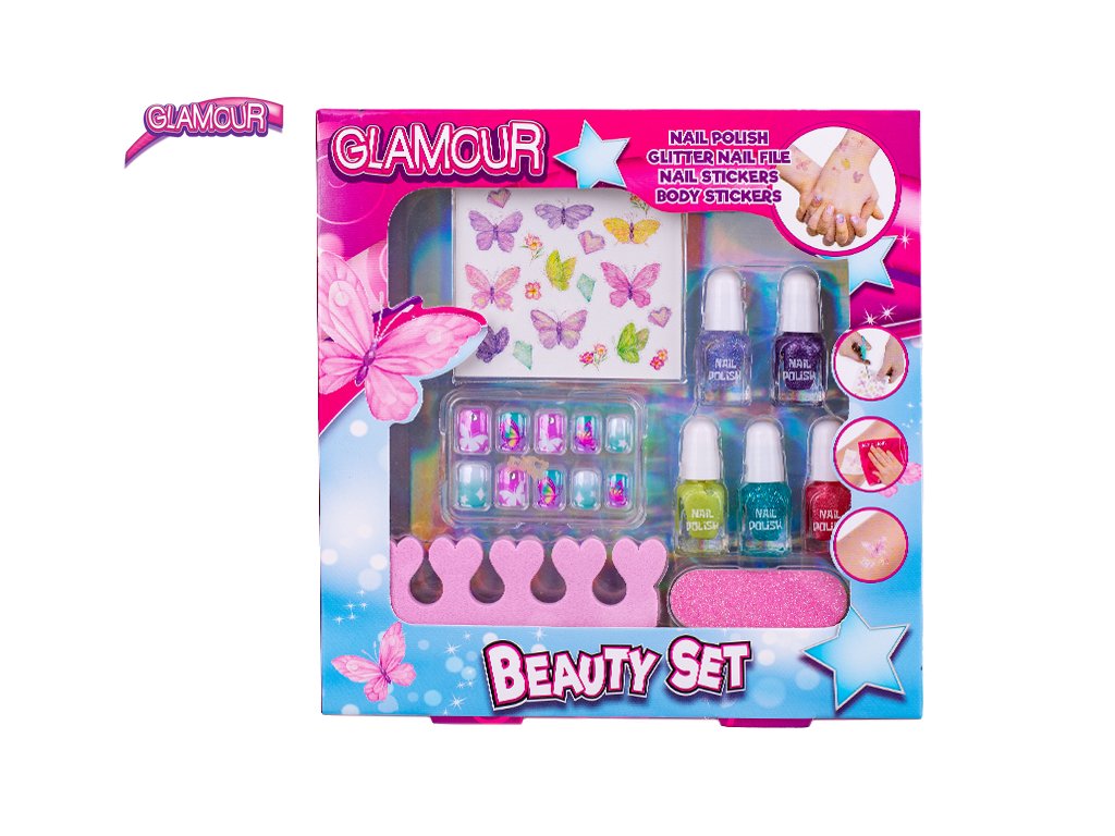 Glamour sada krásy s laky na nehty, pilníkem a nálepkami na tělo a nehty v krabičce