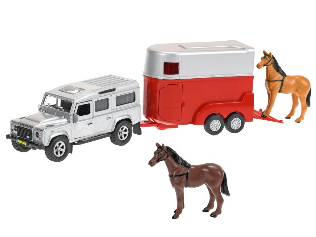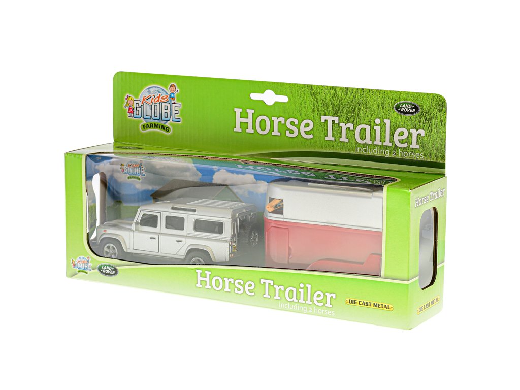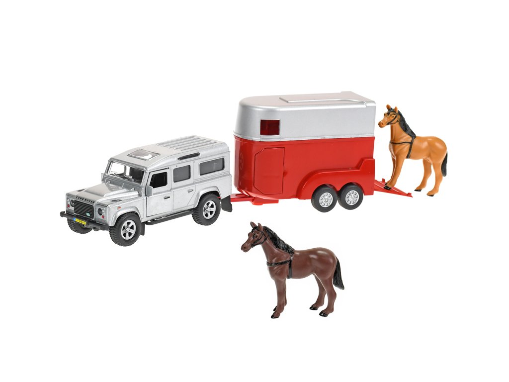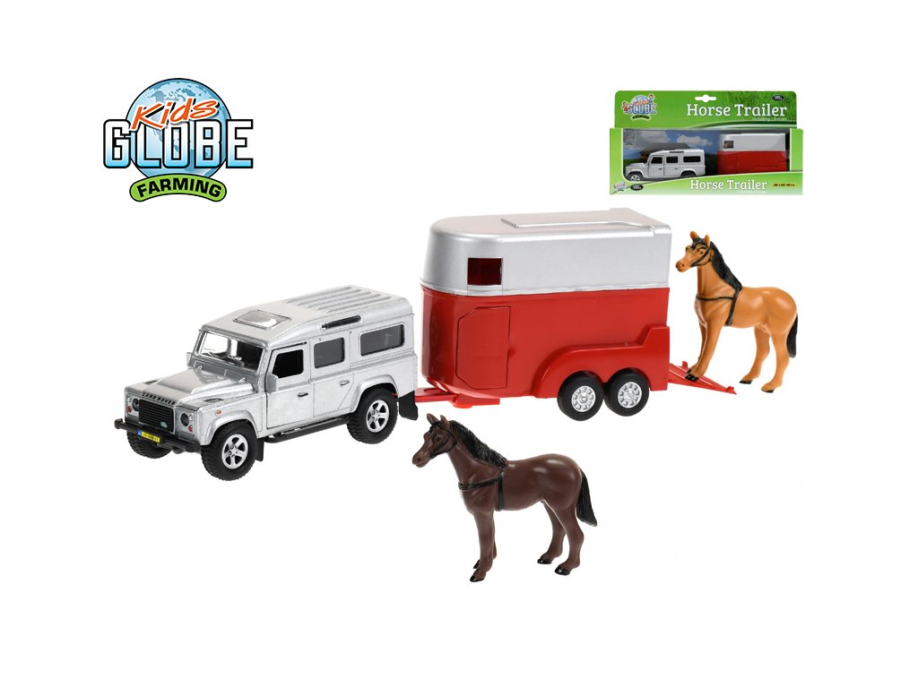 Kids Globe Farming Land Rover Defender kov 14cm zpětný chod s přívěsem pro koně 11cm v krabičce
