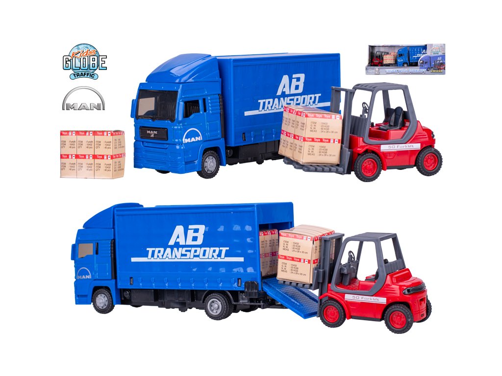 Kids Globe Traffic kamion MAN 17cm kov volný chod s paletovým vozíkem 10cm v krabičce