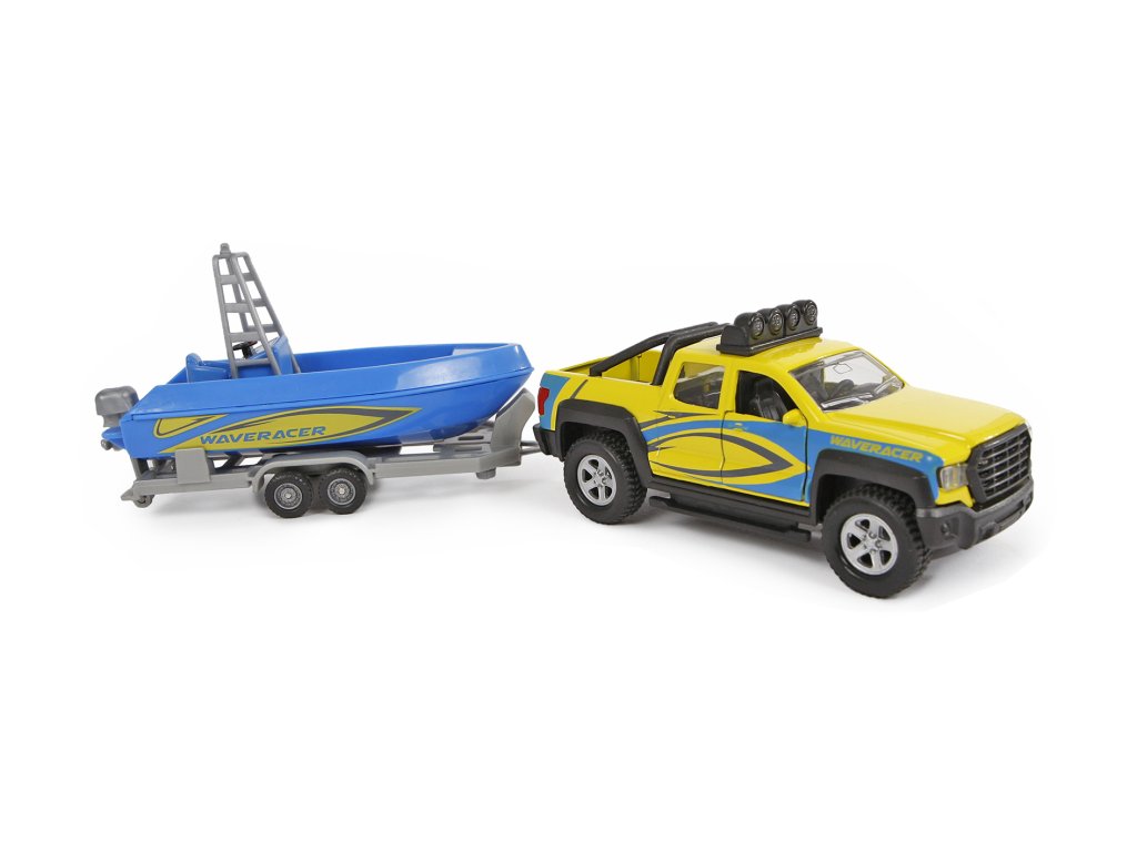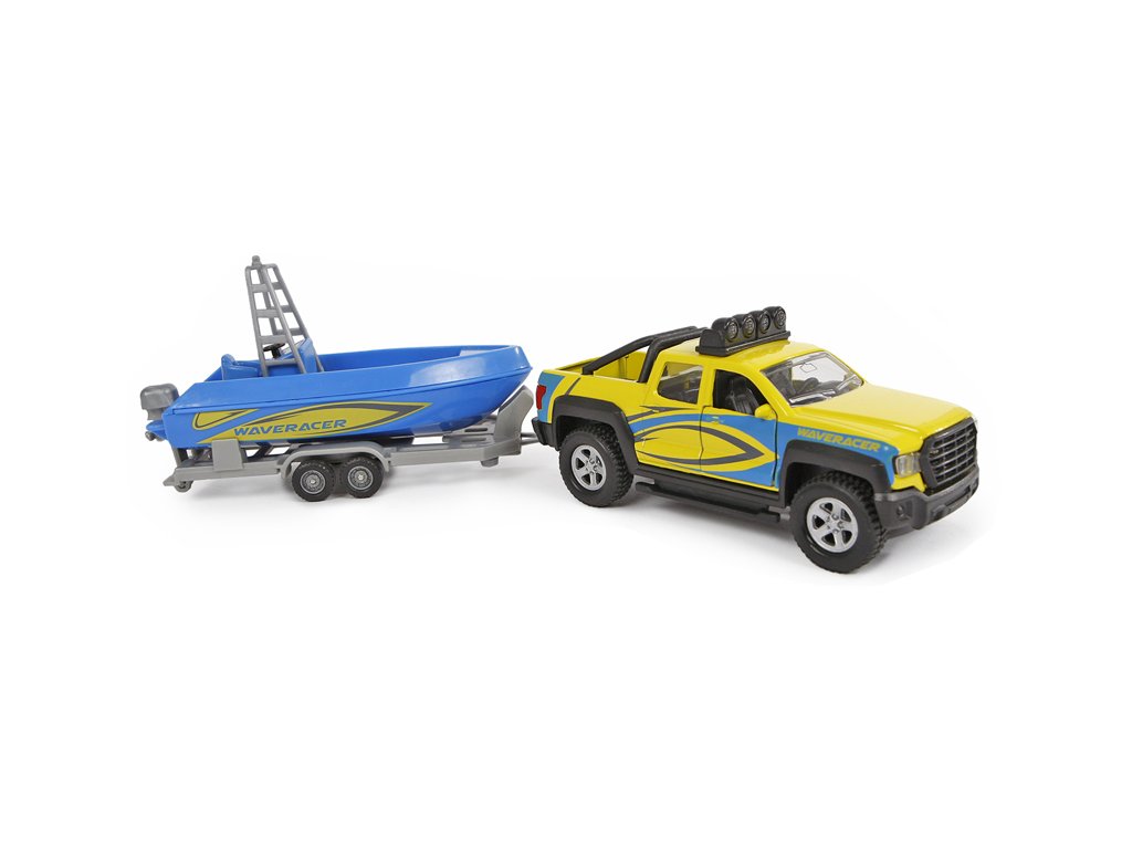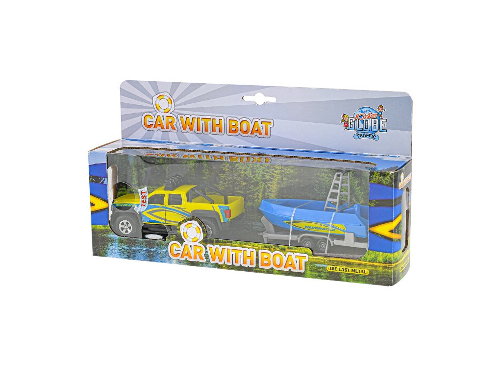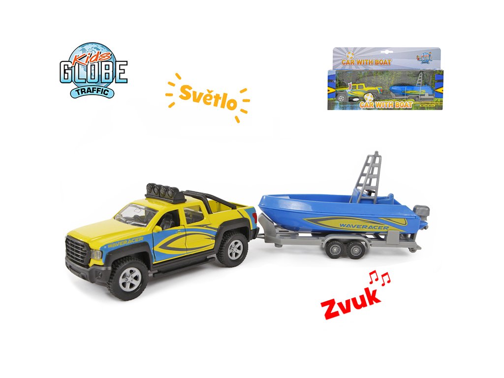Kids Globe Traffic tahač s lodí kov 27cm zpětný chod na baterie se světlem a zvukem v krabičce