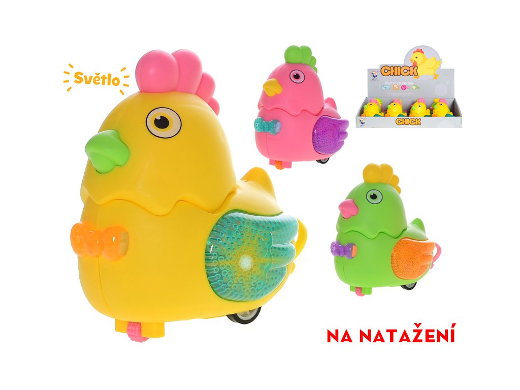 Kuřátko 10cm na baterie jezdící na natažení se světlem 3barvy 12ks v DBX