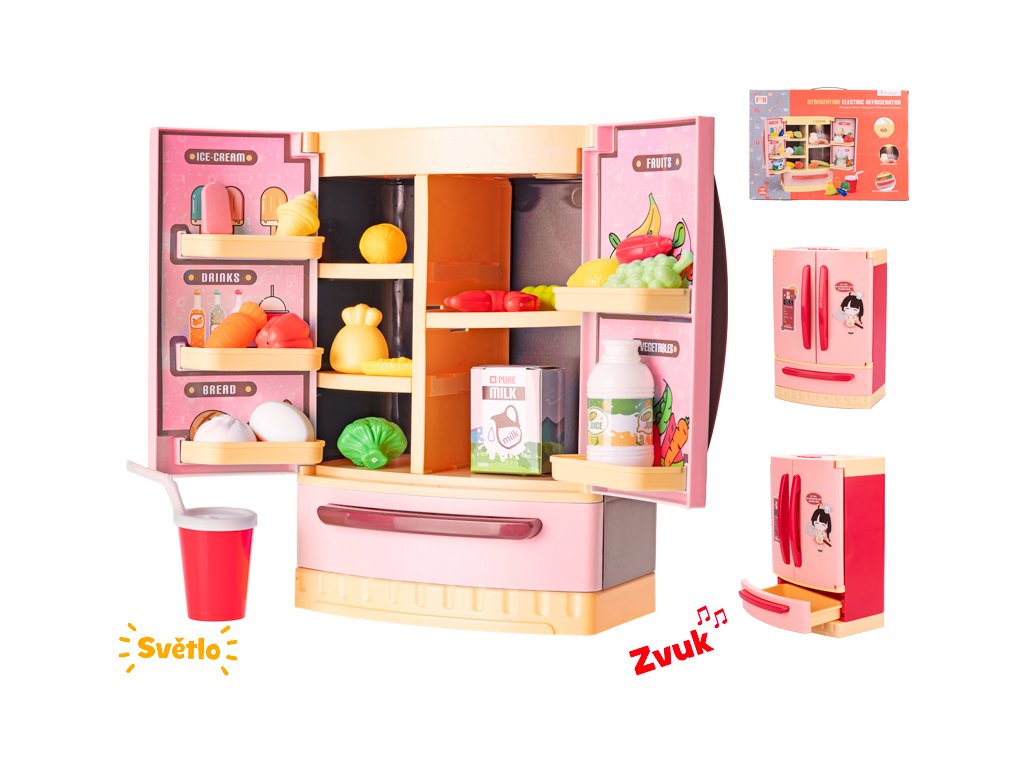 Lednice 26x18x12cm červená na baterie s doplňky se světlem a zvukem v krabičce