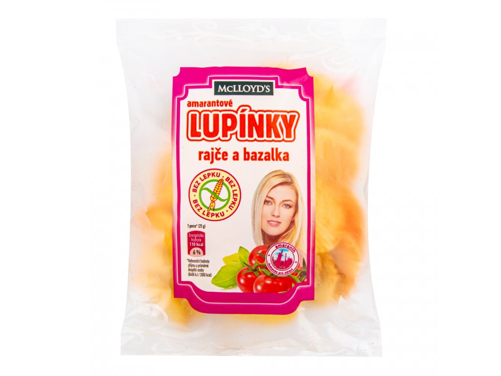 Lupínky vyrobené z kukuřičné a amarantové mouky jemně ochucené rajčetem a bazalkou. Jsou certifikované jako bezlepkové.Specifikace