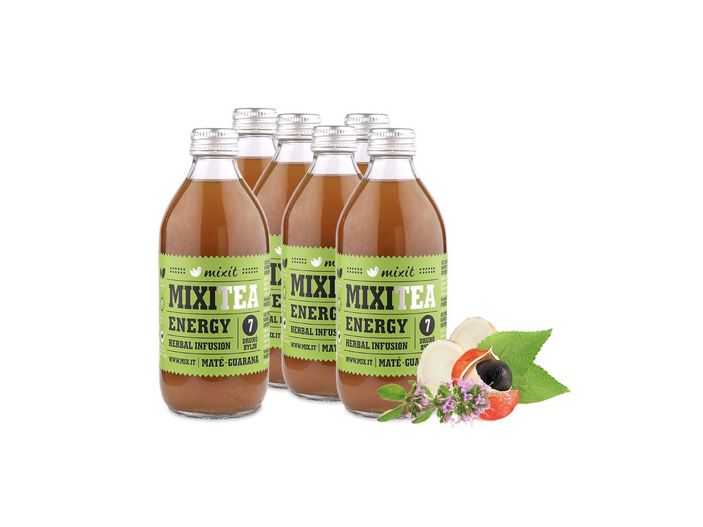 Novinka! První hotový nápoj od Mixit. Jaký je příběh čaje MixiTea Energy? Na začátku bylo přání povzbudit tělo i mysl přírodní silou bylinek bez umělých přísad. Vybrali jsme proto 7 tradičních bylin v té nejlepší kvalitě, poznejte sílu kombinace maté, guarany, citronové trávy, kozince, ženšenu, maralu a mateřídoušky. Každá lahvička ukrývá jejich energii získanou pečlivým zpracováním včetně šetrného procesu louhování pro nejlepší osvěžující zážitek. Prostě MixiTea. Na zdraví! V jedné lahvičce je 330 ml čaje a až 25 mg kofeinu na 100 ml.