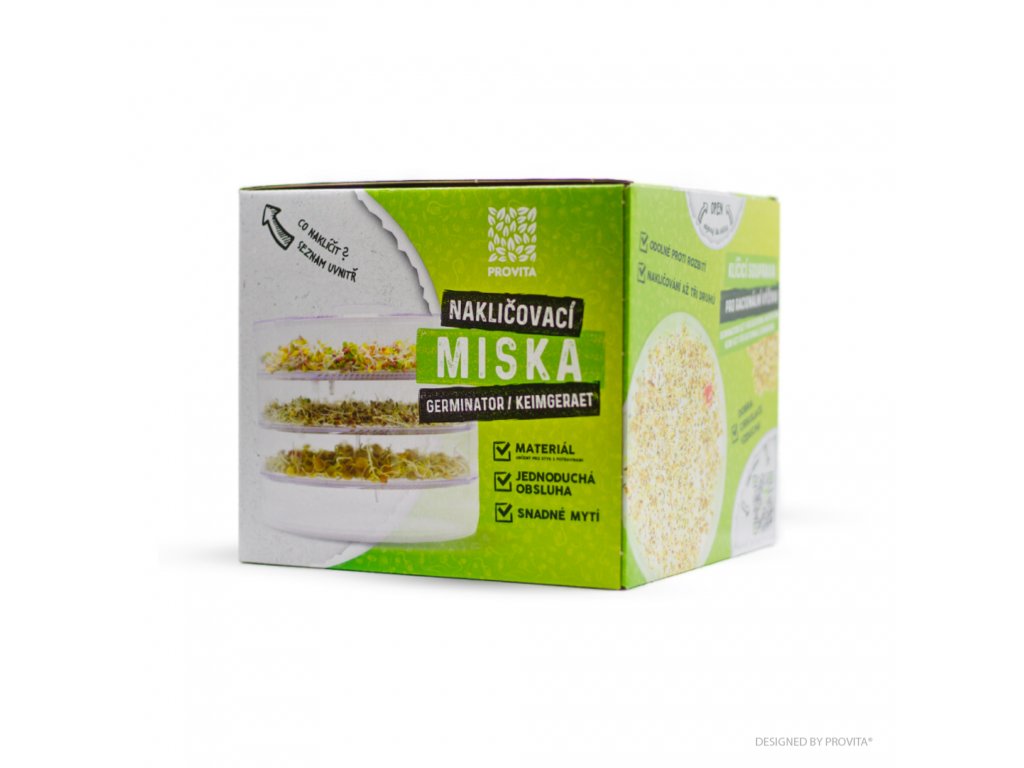Sada ke klíčení semen zajišťuje optimální podmínky při pěstování klíčků a výhonků a snadno se udržuje. Skládá se ze 3 misek o vnitřním průměru 18 cm, kam se umísťují semena, spodní záchytné misky, kam při proplachování stéká voda, a víka, které v miskách zaručuje stabilní vlhké klima.