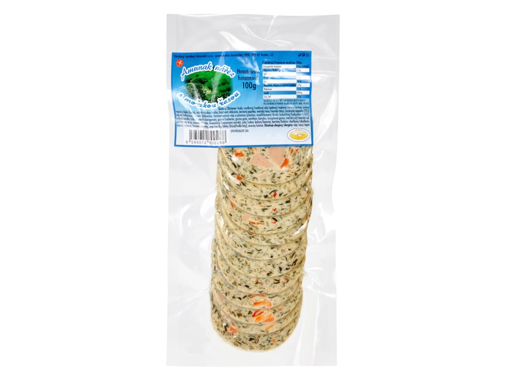 Salám s mořskou řasou. Je nakrájený na tenké, praktické plátky a je tak připravený k rychlé přípravě svačiny. Neobsahuje lepek pochutnají si tak na něm i celiaci.Specifikace