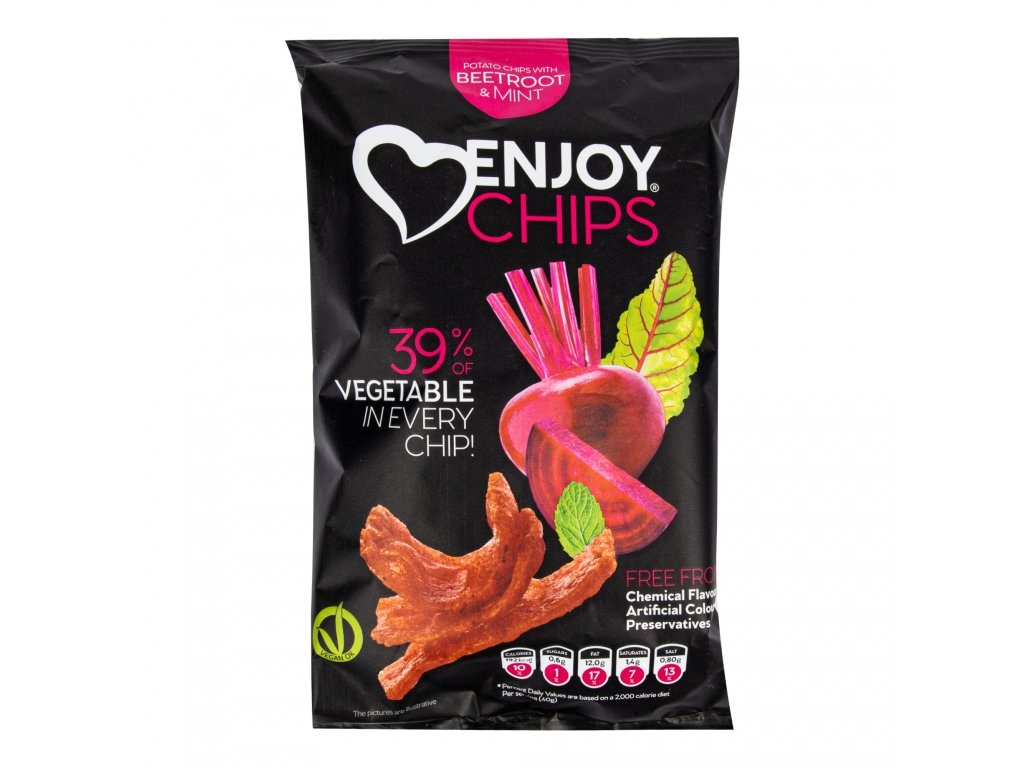 Společnost ENJOY CHIPS SE zaměřuje na výrobu a prodej inovativních produktů s použitím výhradně čerstvé zeleniny, bez použití mouky nebo chemických přísad. Její misí je poskytnout lidem známou pochoutku v podobě chipsu v nejpřirozenějším možném provedení.Složení