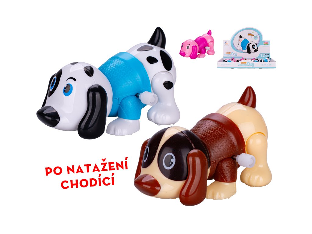 Pejsek 10cm na klíček po natažení chodící 3barvy 12ks v DBX