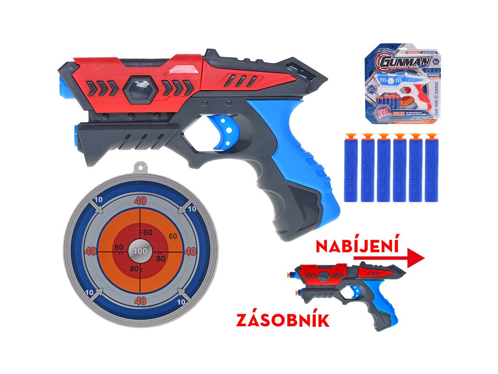 Pistole 21cm s pěnovými náboji 6ks a terčem 2barvy na kartě