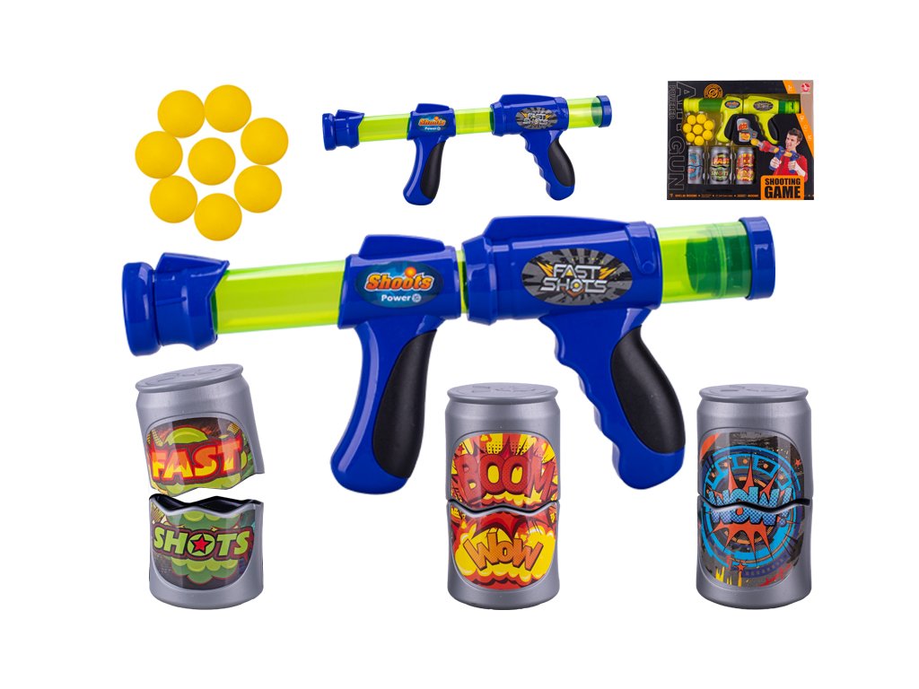 Pistole 42cm na natažení s pěnovými náboji 8ks a plechovkami 3ks 2barvy v krabičce
