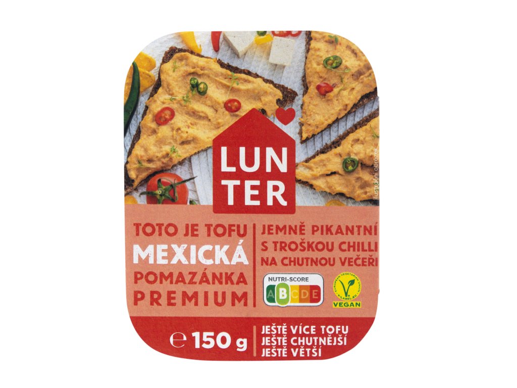 Lunter Tofu 32 % (SÓJOVÉ boby, voda), řepkový olej, okara (voda, SÓJOVÉ boby), sušené potravinářské droždí, kukuřičný škrob, cibule, paprikové vločky červené a zelené 1,7 %, jedlá sůl, směs koření, chilli 0,3 %. Může obsahovat stopy hořčice a sezamu.Nutriční složení