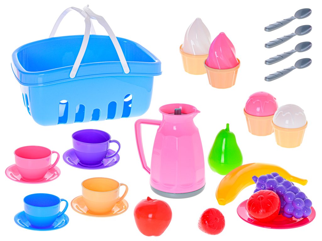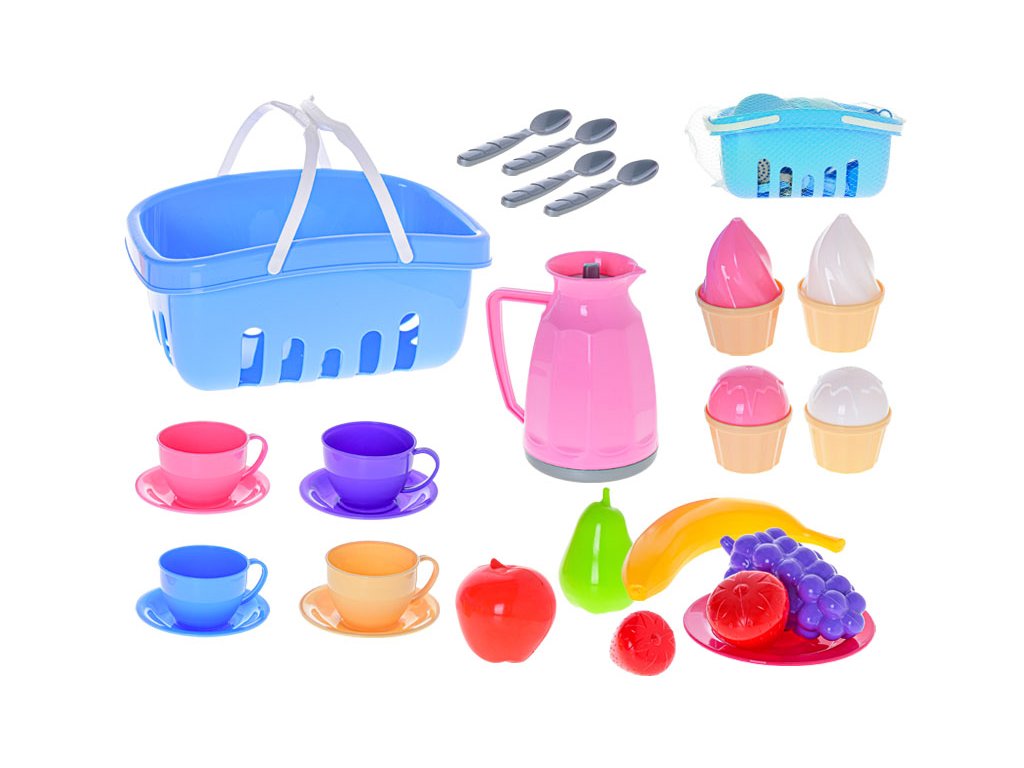 Sada čajového servisu v košíku s 25ks nádobí a potravinami v síťce