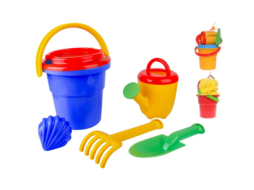 Sada na písek 6ks s kbelíkem 18cm 3barvy v síťce 12m+