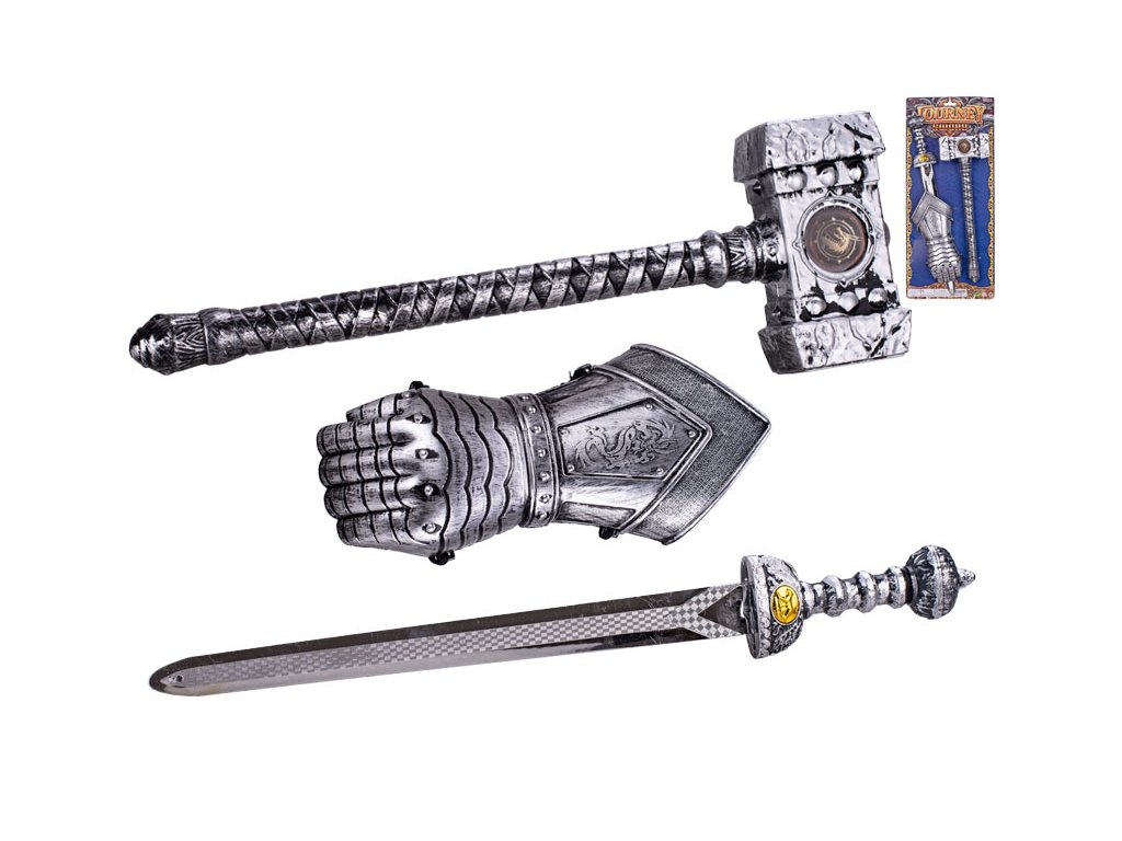 Sada rytíř kladivo 38cm, meč a rukavice na kartě