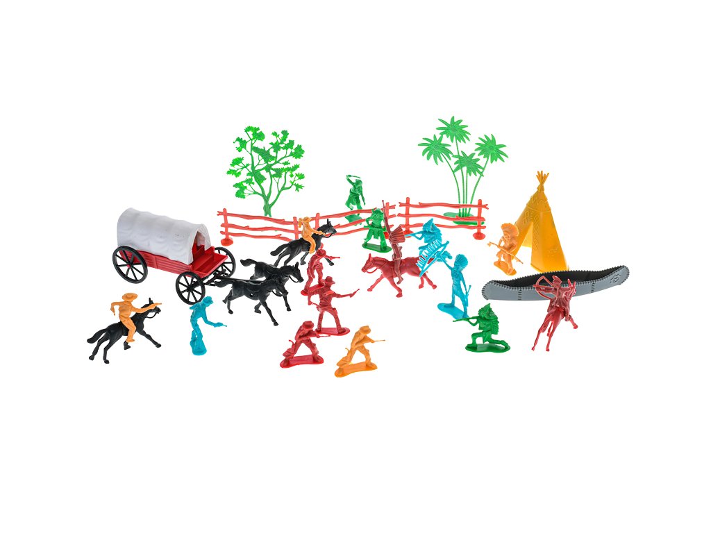 Sada western figurky 31ks s kočárem a doplňky na kartě