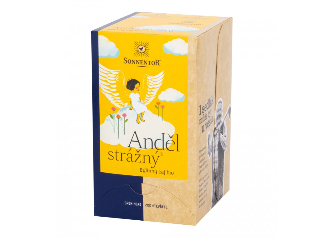 Obsahuje vyváženou směs bylinek a koření, které spolu tvoří unikátní kořeněnou chuť. Výborně chutná vlažný, oslazený kapkou medu. Čaj Anděl strážný obsahuje kousky sušených jablek pro sladkou chuť, pikantní koriandr, nasládlý fenykl, osvěžující mátu, uklidňující meduňku a jemně nakyslé šípky, které se spolu se sušenými květy chrpy starají o sytou barvu čaje. Všechny obsažené suroviny jsou v bio kvalitě.