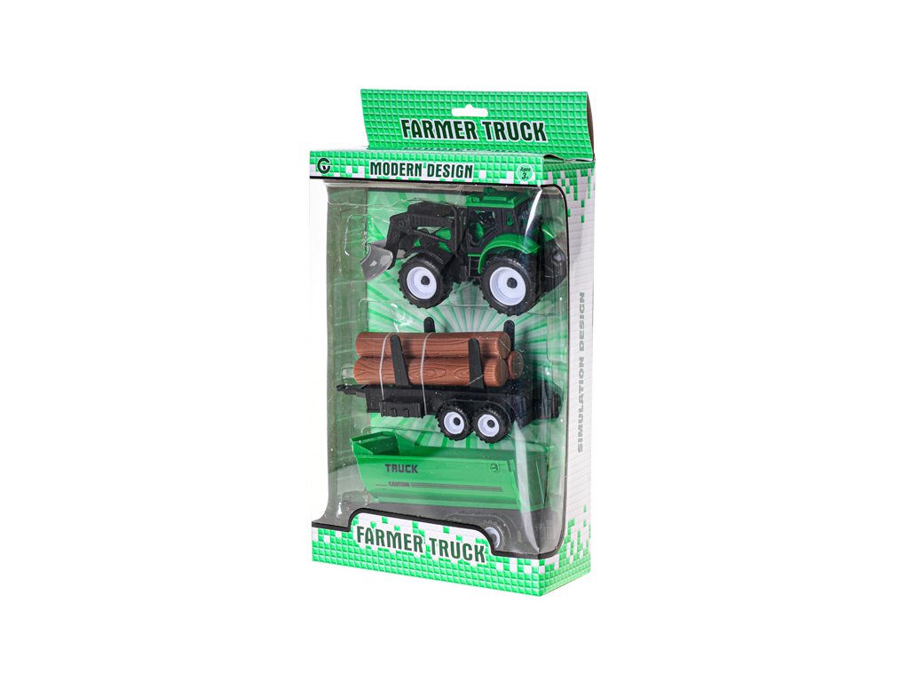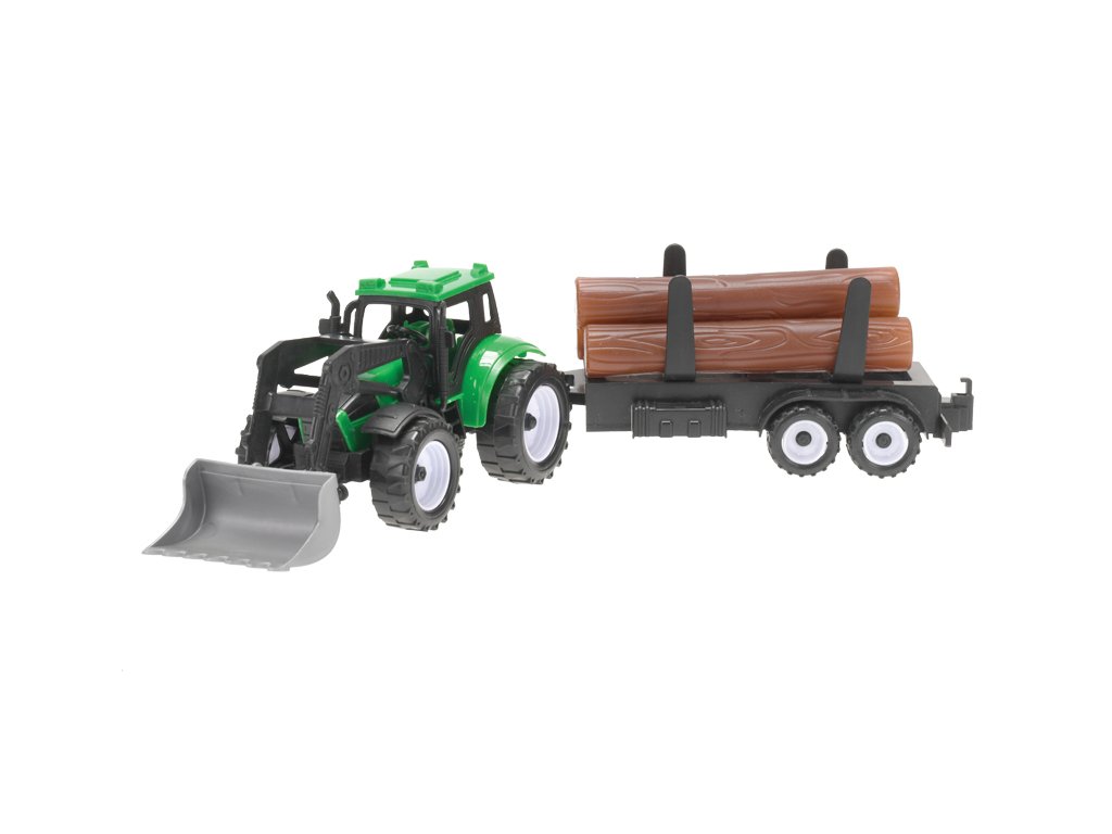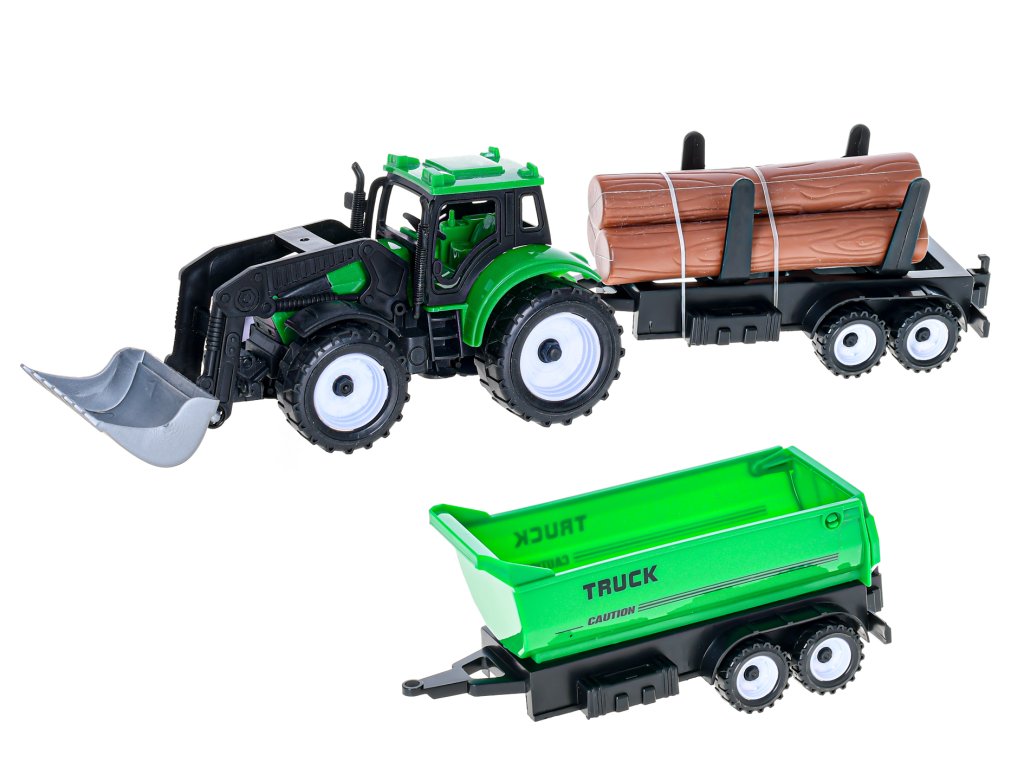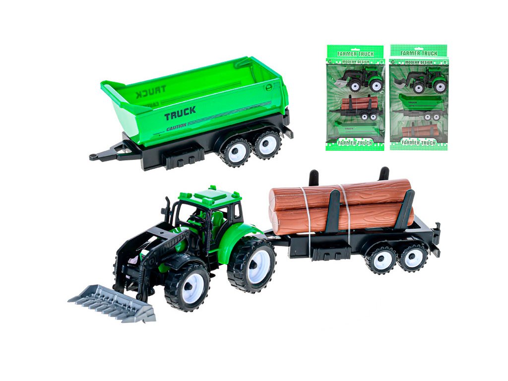 Traktor nakladač 17cm 3druhy na setrvačník + 2vlečky v krabičce