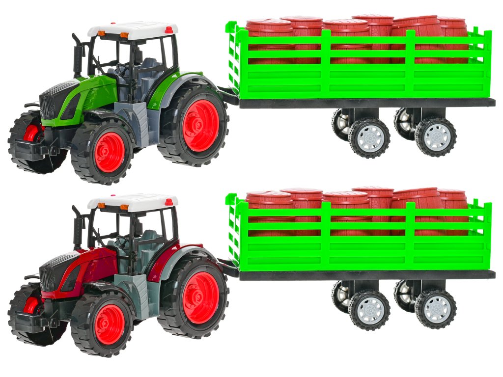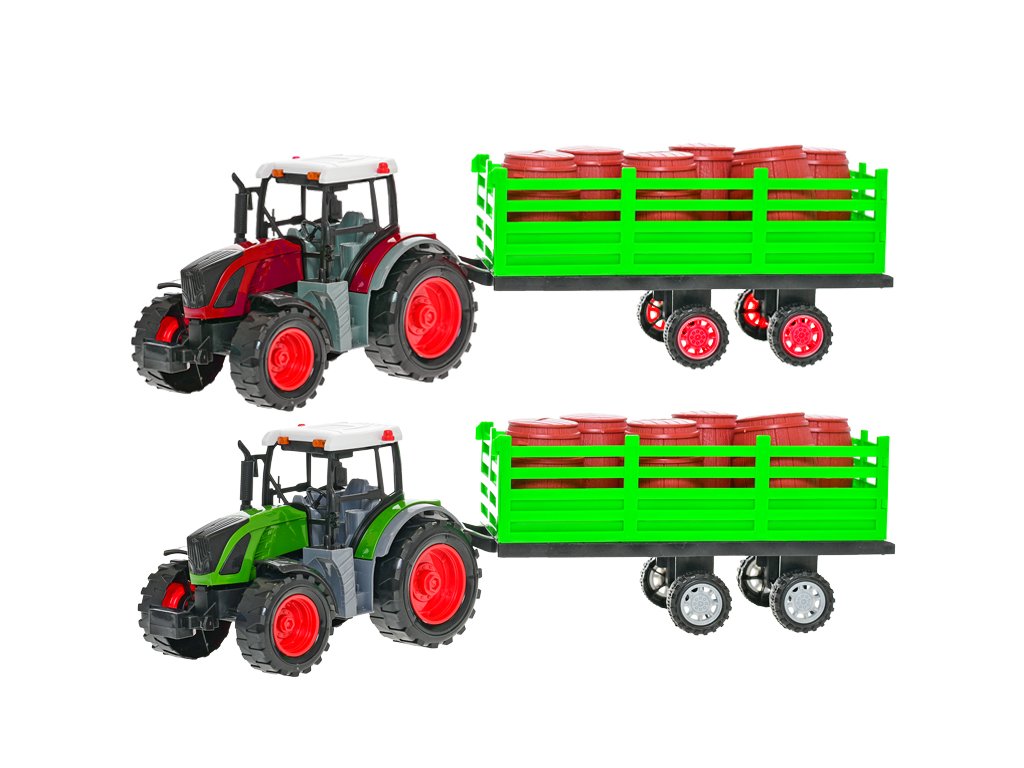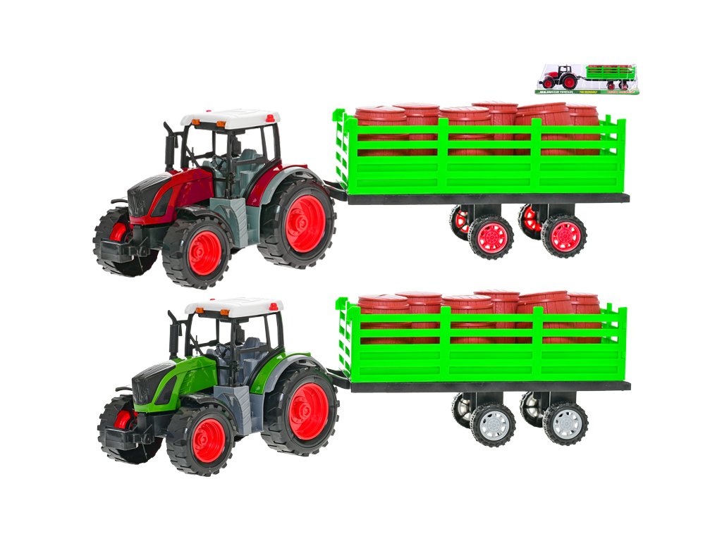 Traktor s vlečkou 50cm na setrvačník + 6ks sudů 2barvy v krabičce