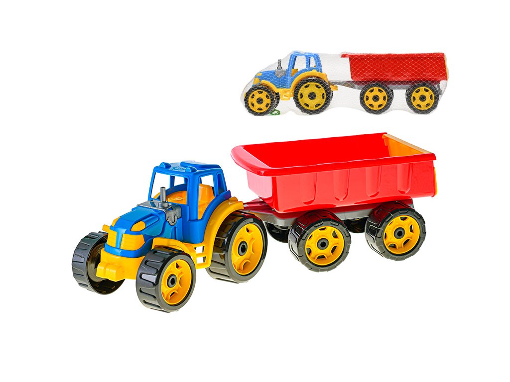 Traktor se sklápěcím přívěsem 54cm modro/červený 24m+ v síťce