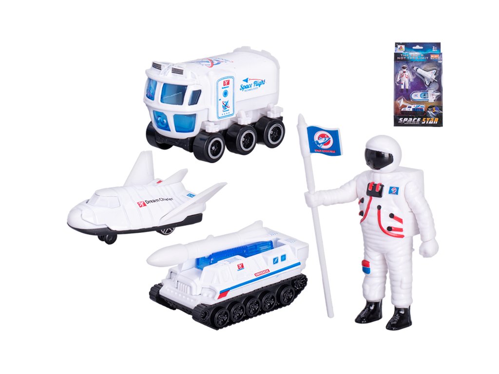 Vesmírná vozidla 5,5-8,5cm kov volný chod 3ks s astronautem 7,5cm 2druhy v krabičce