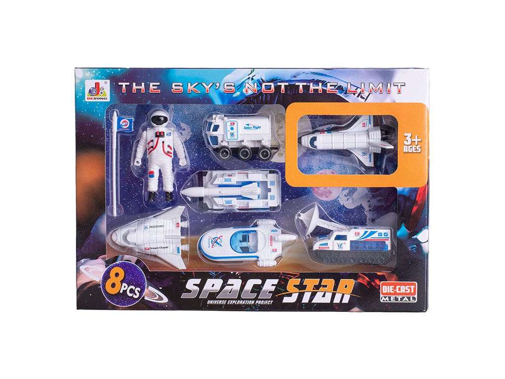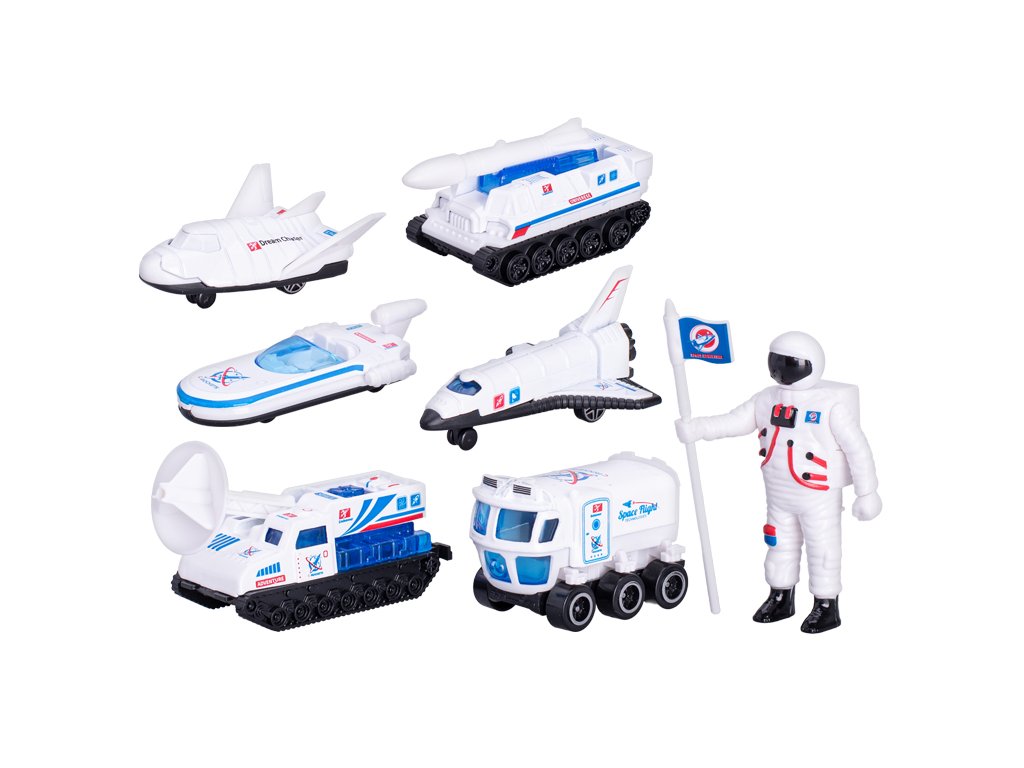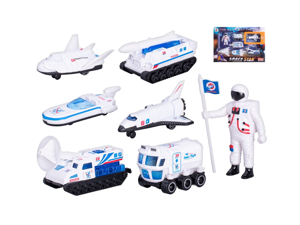 Vesmírná vozidla 6-8,5cm kov volný chod 6ks s astronautem 7,5cm v krabičce