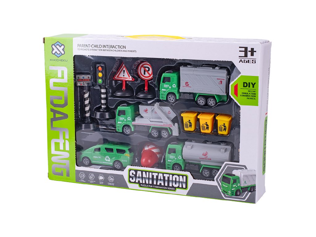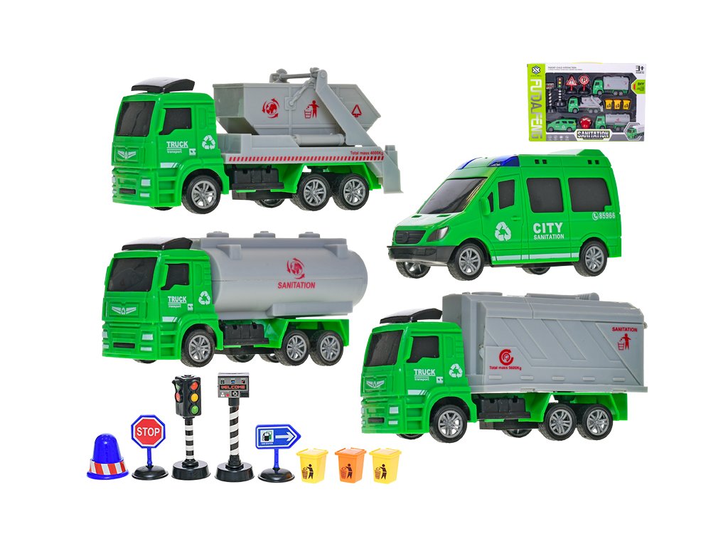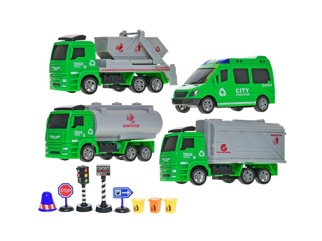 Vozidla úklidové služby 11-12cm zpětný chod 4ks s doplňky 2druhy v krabičce