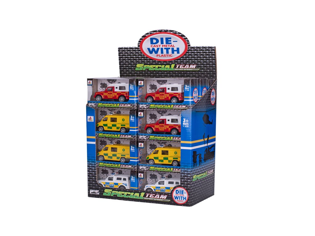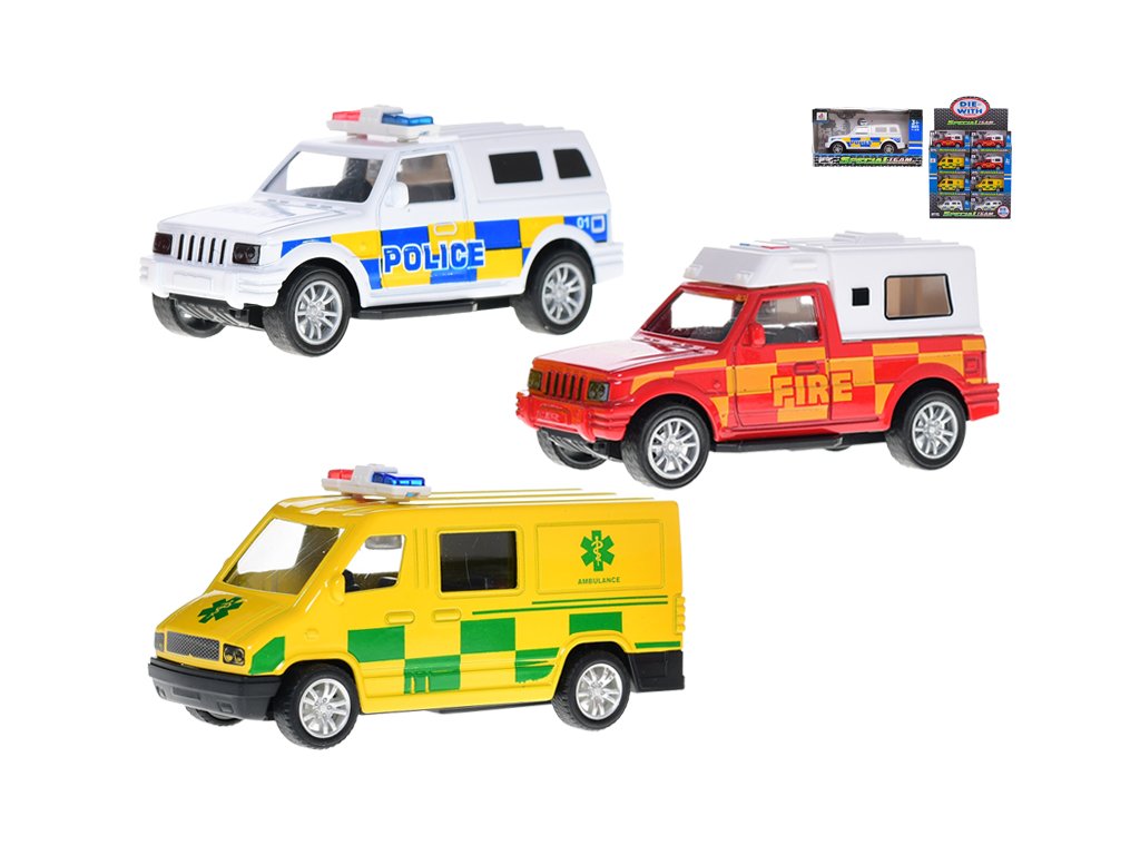 Vozidla záchranných složek 11cm kov zpětný chod 3druhy v krabičce 24ks v DBX